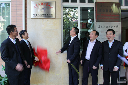 12月5日,“中华文化外译工作室”揭牌仪式在广外高翻学院隆重举行。在喜庆的礼炮声声中,在彩带飘飞的蓝天白云下,广外许国彬副校长、顾也力副校长、科研处处长阳爱民与我协副会长,高翻学院院长平洪、党委书记高云坚共同揭下红幕,同全院全体教职员工一起见证了这一刻。此举标志着“中华文化外译工作室”在高翻学院正式成立。