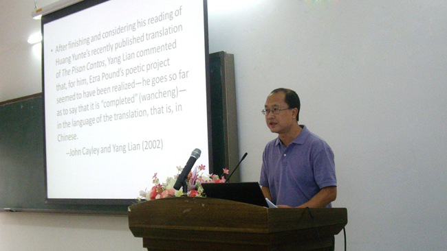 谈到庞德诗歌的特点,黄教授说,庞德经常在诗歌中引用四书五经,所以在翻译庞德的诗歌便像是把诗歌“翻译回去”(translate back),但是遇到的一个问题便是到底是不是要直接翻回四书五经的原文?黄教授举了一个例子,比如庞德自己在用到《论语》的“学而时习之,不亦说乎”时,庞德的原文是“To study with the white wings of time passing is not that our delight?” 而如果直接翻回《论语》的原文,则中国的读者无法体会到庞德对中国古典文化的理解。所以黄教授的做法是先把英文翻成现代汉语,而把《论语》的原文作为注释。这样便保留的庞德的翻译痕迹,便于中国读者进一步了解庞德。而庞德诗歌的另外一个特点是多语言创作。经常在诗歌中除了英文外还夹杂拉丁文,所以黄教授一开始的做法是把所有的语言都翻成中文。对于这一点黄教授现在是持不同意见的,他提到当时是因为自己必须遵照出版社的要求全部翻成中文,但是当现在自己可能稍微能坚持自己的想法并且被采取的时候,他是想保留庞德诗歌中的多语言特点的。即是只把英文部分翻成中文,而其他的语言保留原貌。虽然可能给读者造成一定的阅读困难,但是只有这样才能体会多语言的魅力,黄教授强调说翻译的层次实在语言的转换之间体现出来的,并且翻译也是诗歌的语言基础,所以尽可能保留庞德诗歌的多语言特性,也能让中国的读者更加感受到庞德诗歌创作中的语言之美。