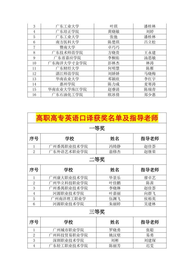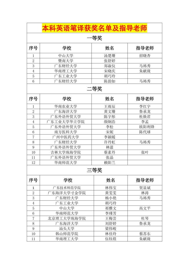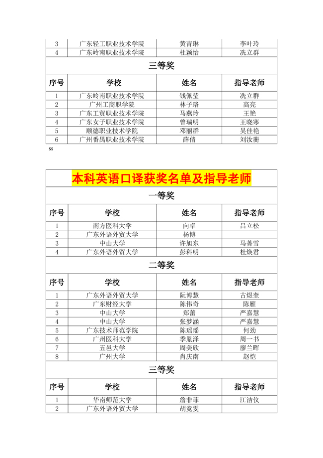 第五届广东大学生翻译大赛获奖名单及指导老师