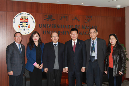 在澳门大学,仲伟合一行与该校校长赵伟、全球事务总监兼校长特别顾问冯达旋以及全球事务部高级行政助理戴美仪就进一步加强合作进行了会谈。双方共同回顾了2009年签订学生交换协议以来的合作情况,并在人才培养、葡语师资培训等方面达成了初步共识。