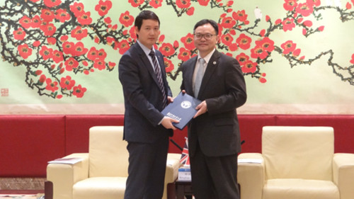 刘建达首先对到访代表团成员的到来表示热烈欢迎,并对广外翻译学科的发展概况和优势进行简单介绍。双方都对翻译学硕士培养项目表示期待,希望以后两个学校之间有更多合作交流。随后刘建达代表学校向杜伦大学代表团赠送礼物并合影。