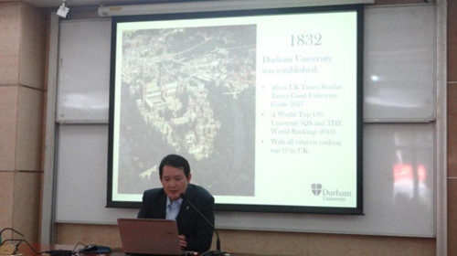 会后,杜伦大学代表团一行前往六教B103为翻译学院师生开展主题讲座。本次讲座由广外高级翻译学院副院长邢杰主持。讲座开始前,郑冰寒对杜伦大学的历史地理、学科设置以及办学条件等进行简单介绍,让在场师生对杜伦大学有更加全面的了解。