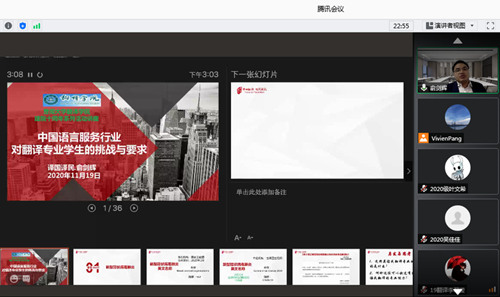 讲座中,俞剑辉总经理首先以新冠病毒的中英名称对照为例子,启发同学们思考翻译专业学习的重要意义以及如何有效提升专业能力。随后,他讲述了语言服务的概念与覆盖范围、语言服务企业在疫情期间面临的主要困难,以及未来五年语言服务行业的发展趋势,从而引导同学们全面认知自身专业所处的行业发展情况。最后,俞剑辉总经理阐述了语言服务行业对翻译专业的三项能力要求,即以职业素养、翻译素养和管理素养为导向的能力培养和能力不足所面临的挑战。