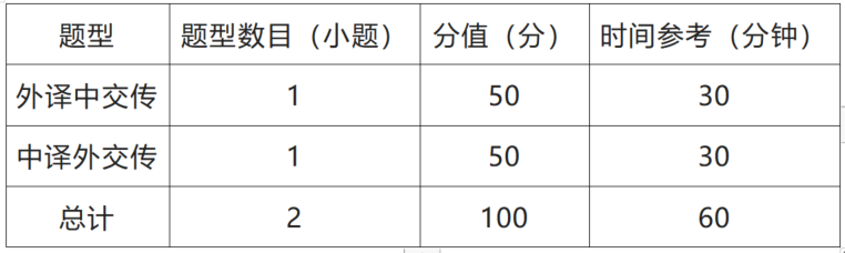 满分为100分,时间为120分钟,共2种题型2道题,全部为主观题。参赛选手可使用中译外、外译中纸质版词典各1本。