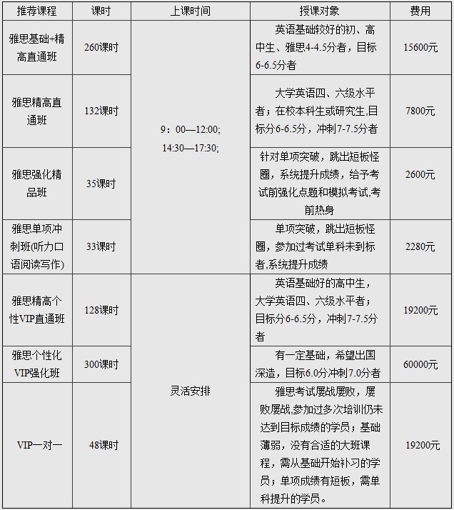 1)基础班、精高班、强化班:学员10-15人。其中资料费400元/人。雅思听力、口语、阅读、写作单项冲刺班:其中资料费120元/人。个性化VIP班:学员4-6人,其中资料费800元。教材均由教师研发团队精编精选提供。